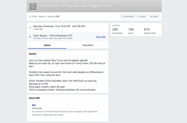 A now-unavailable Facebook page for the Nov. 12, 2016, march shows the event’s host as BM, a known alias of the BlackMattersUS used throughout the group's promotional materials for other sponsored protests, and encouraged protesters to meet at Union Square at 12 p.m. to march to Trump Tower.