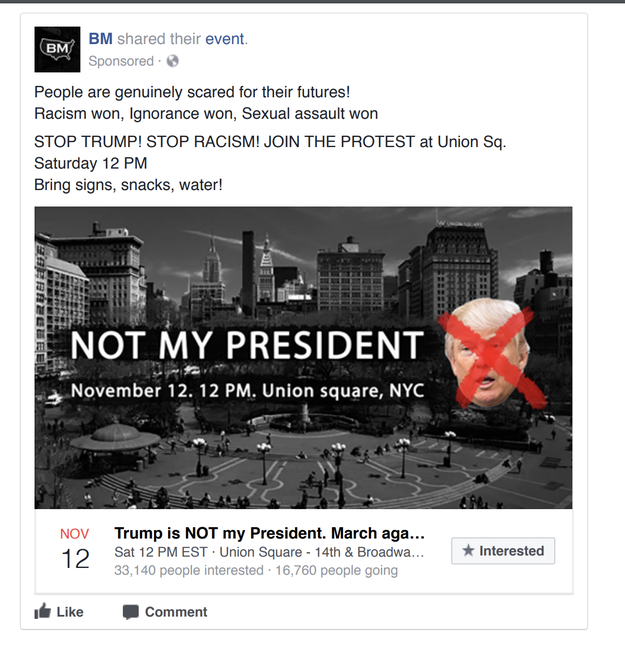 On Wednesday afternoon, after BuzzFeed News published this report, the House Intelligence Committee released a sampling of Facebook ads linked to Russia. One of the ads released was a sponsored post for the Nov. 12 anti-Trump march at Union Square.