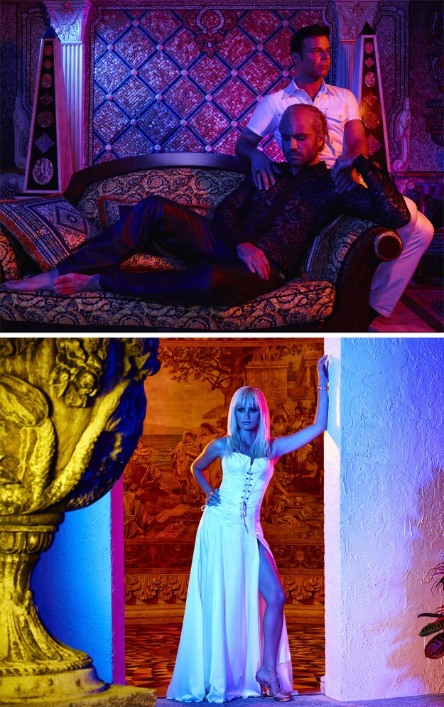 Dramatic cast photos of Edgar Ramirez as Gianni Versace, Ricky Martin as Antonio D'Amico, and Penelope Cruz as Donatella Versace.