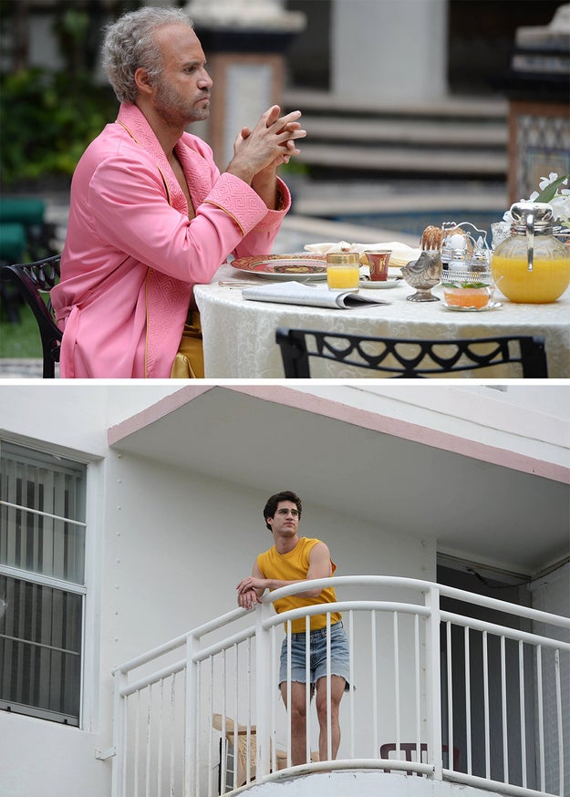 Ramirez as Versace at his home estate (top) and Criss as Cunanan at a shabby hotel.